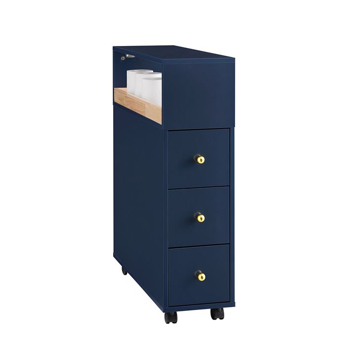 SoBuy Meuble Salle de Bain Étroit sur Roulettes Rangement WC Compact avec Plateau Amovible et 3 Tiroirs Bleu 23x65x83 cm