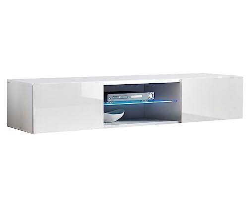 MB Muebles Bonitos, Meuble TV Mural Tibi avec Lumière LED pour Salon Moderne, Suspendu au Mur, 1 Porte 3 Compartiments, Couleur Blanc, 160x30x38.5 cm