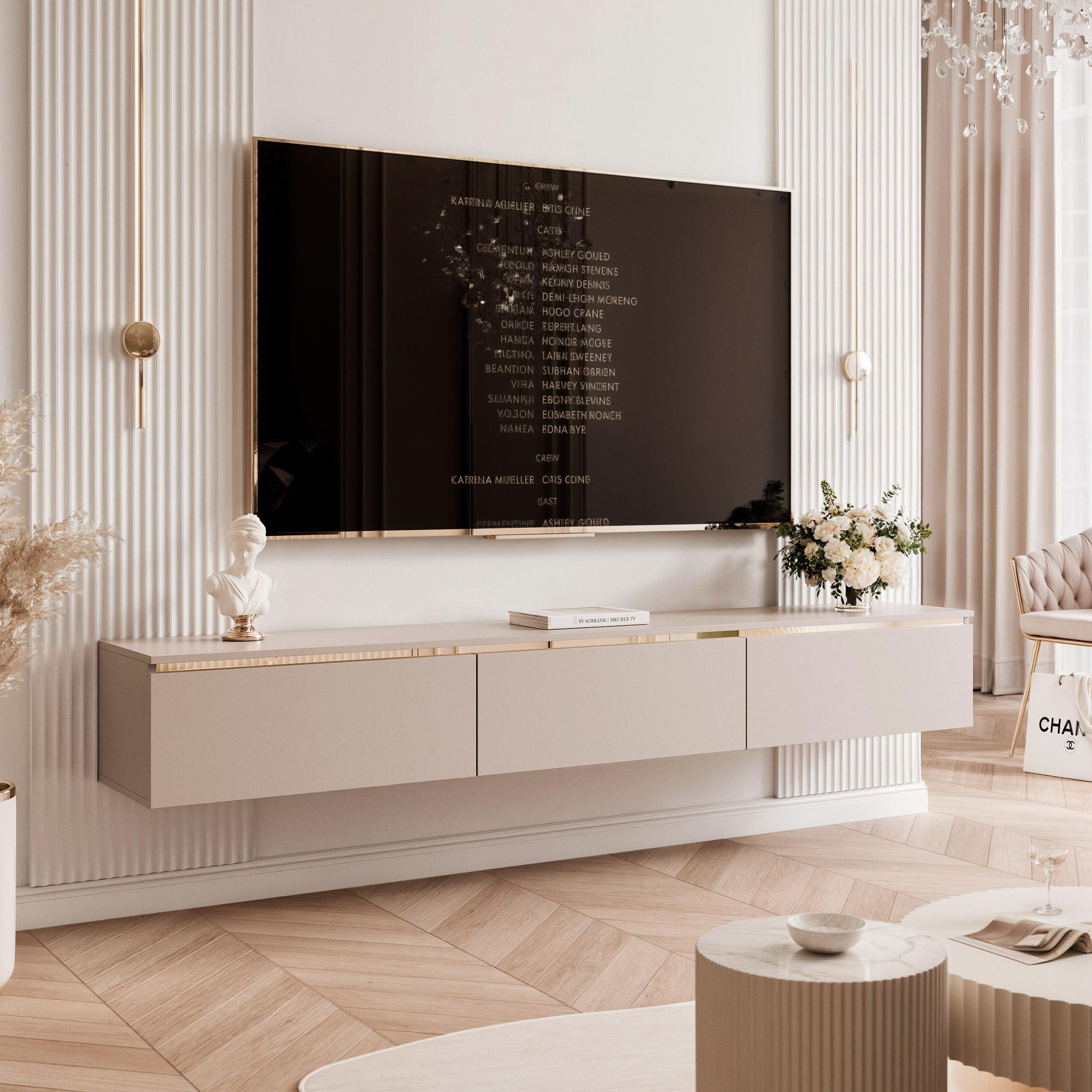 Meuble TV bas IdohomeTV SELIA 200 cm, cachemire, moulure dorée, système Push-to-Open, élégant meuble TV suspendu pour salon, meuble TV, meubles TV