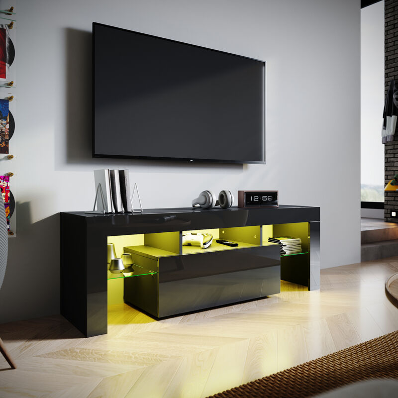 Eifson - Meuble tv 145 cm, avec éclairage led, 2 tiroirs, 4 portes, cloisons ouvertes, surface vitrée, finition brillante, meuble tele lowboard pour