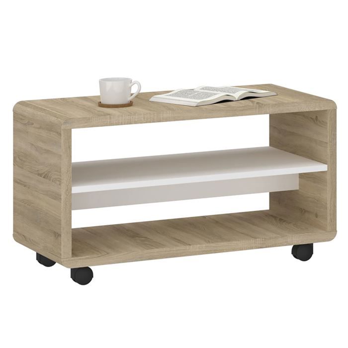 Meuble TV sur roulettes ISABA avec 2 niches de rangement meuble télé en mélaminé chêne sonoma et blanc