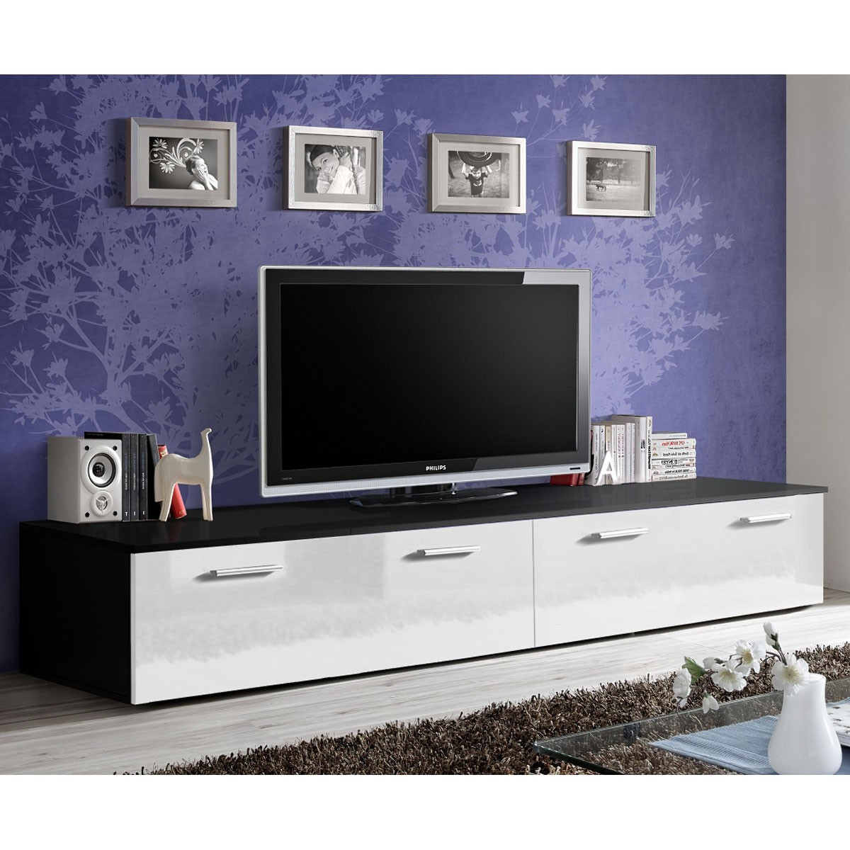 Meuble TV Aapaas 200 cm haut brillant blanc/noir avec LED – design moderne, surface verre pour salon