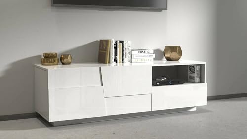 Dmora - Meuble TV Velio, Buffet Bas de Salon avec 2 Portes et 1 tiroir, Base Meuble TV, 150x44h46 cm, Blanc Brillant