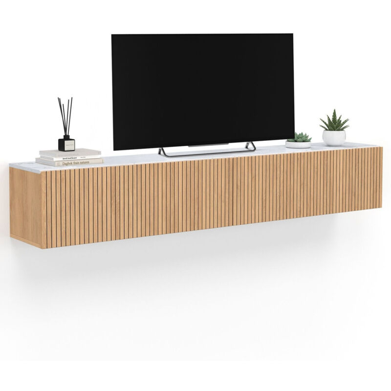 Meuble TV 180 cm suspendu JULIETTE plateau effet marbre lattes tasseau bois coloris chêne