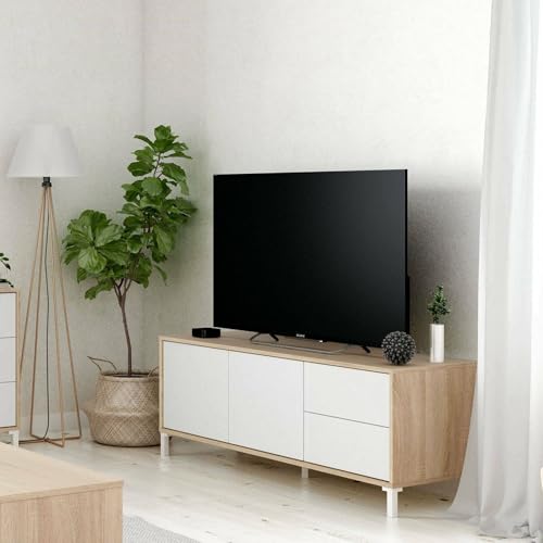 Dmora Meuble TV Cary, Buffet pour télévision avec 2 portes, Meuble TV de Salon, Blanc et Chêne, 130x41h47 cm