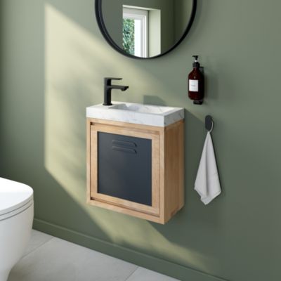 Ensemble meuble lave-mains à suspendre Indus chêne massif l.44 cm + plan vasque lave-mains effet marbre blanc