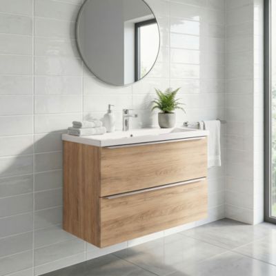 Meuble vasque faible profondeur suspendu effet chêne clair l.90 cm + plan de toilette, Calao