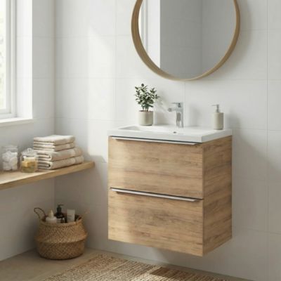 Meuble vasque suspendu faible profondeur effet chêne l.60 cm Imandra + plan vasque blanc céramique Nira, GoodHome