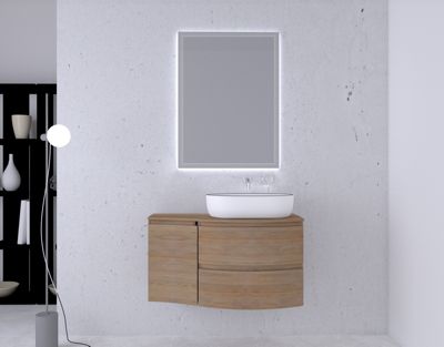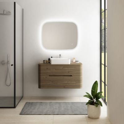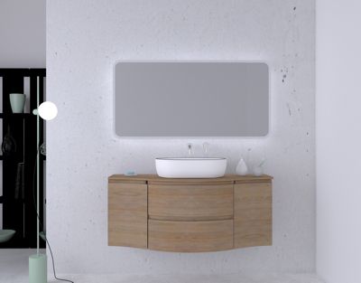 Ensemble Vague L.104 cm meuble sous vasque à suspendre décor bois + plan de toilette + complément gauche