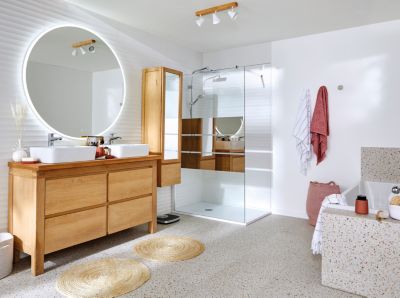 Meuble vasque à poser chêne massif et plaqué chêne l.140 cm + plan de toilette stratifié effet chêne, Cooke & Lewis Harmon