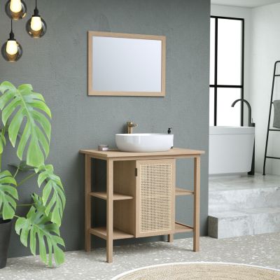 Meuble sous vasque à poser avec plan de toilette l.84 x H.80 x P.50 cm, 1 porte, placage chêne et cannage, Thiam