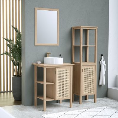 Meuble vasque à poser 1 porte avec plan de toilette l.61 x H.80 x P.50 cm, placage chêne et cannage, Thiam