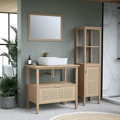 Meuble sous vasque à poser 1 tiroir avec plan de toilette l.84 x H.80 x P.52,5 cm, placage chêne et cannage, Thiam