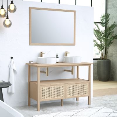 Meuble sous vasque à poser 2 tiroirs avec plan de toilette l.114 x H.80 x P.52,5 cm, placage chêne et cannage, Thiam