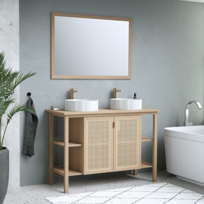 Meuble vasque à poser 2 portes avec plan de toilette l.114 x H.80 x P.50 cm, placage chêne et cannage, Thiam