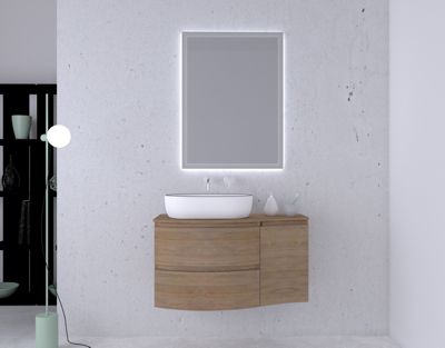 Ensemble Vague L.104 cm meuble sous vasque à suspendre décor bois + plan de toilette + complément droit