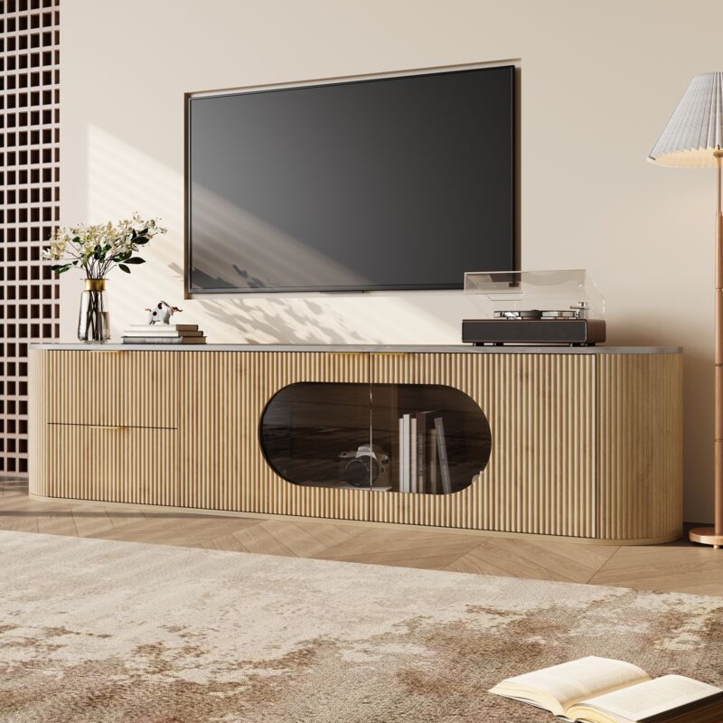 Meuble TV avec 2 Portes 3D, 2 Tiroirs et Vitrine Ovale en Verre Gris, Style Minimaliste, 172×38×45,5 cm, Naturel