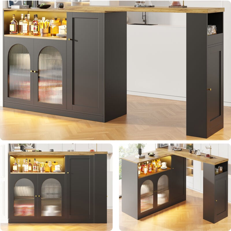 Table de bar rotative à 360° (corps principal : 108 x 39,6 x 97 cm), meuble noir mat avec bureau en grain de bois, avec porte de vitrine en verre
