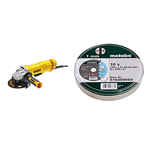 DEWALT - Meuleuse Compacte avec Interrupteur à Palette - Lame Ø125mm - Vitesse 11500tr/min - 1400W & Metabo - Boite métal de 10 Disques à tronçonner - Acier inoxydable - 125 x 1 mm (Import Allemagne)