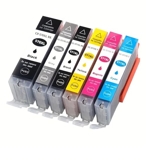 Lot de 6 Cartouches d'encre Rechargeables compatibles Canon PGI-570 + CLI-571 Noir, Cyan, Magenta, Jaune, Gris pour Pixma MG7750 MG7751 MG7752 MG7753 TS8050 TS8051 TS8052 TS8053 TS9050 TS9055