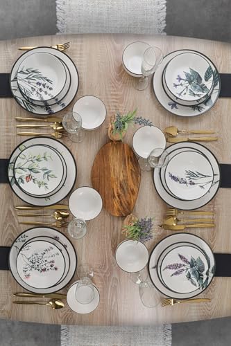 Ensemble de dîner élégant de 18 pièces, 100% porcelaine. Comprend 6 assiettes de service (27 cm), 6 assiettes profondes (21 cm), 6 bols (16 cm) | Passe au lave-vaisselle et au micro-ondes