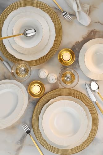 Élégant service à dîner 26 pièces, 100% porcelaine, blanc et doré | Comprend des assiettes de service, des assiettes profondes, des bols et des assiettes | Passe au lave-vaisselle et au micro-ondes