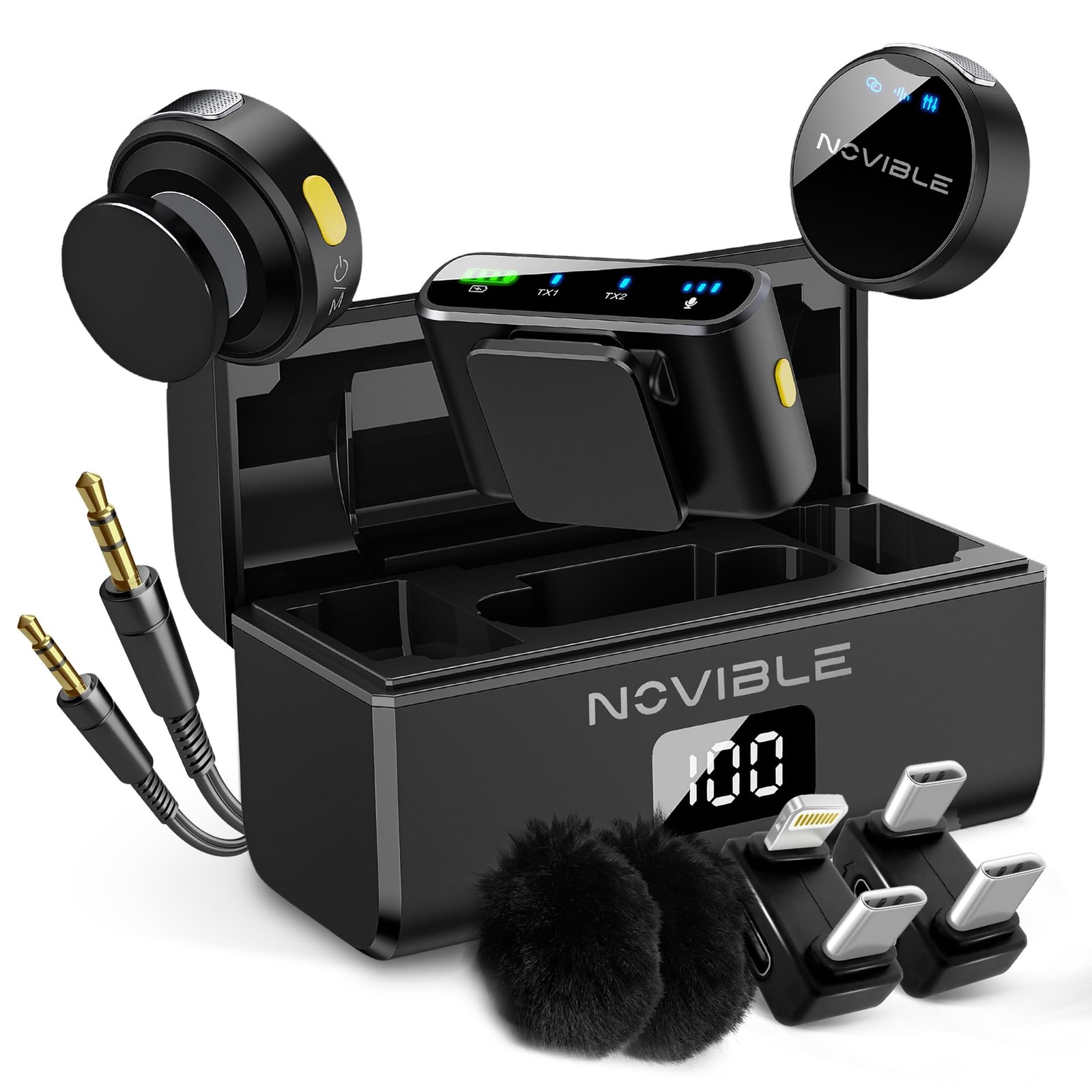 Novible - Micro Cravate sans Fil pour iPhone, Android, Caméra, PC - Microphone Lavalier, Réduction de Bruit, Transmission 100 m - Autonomie 25 h avec Boîtier de Recharge