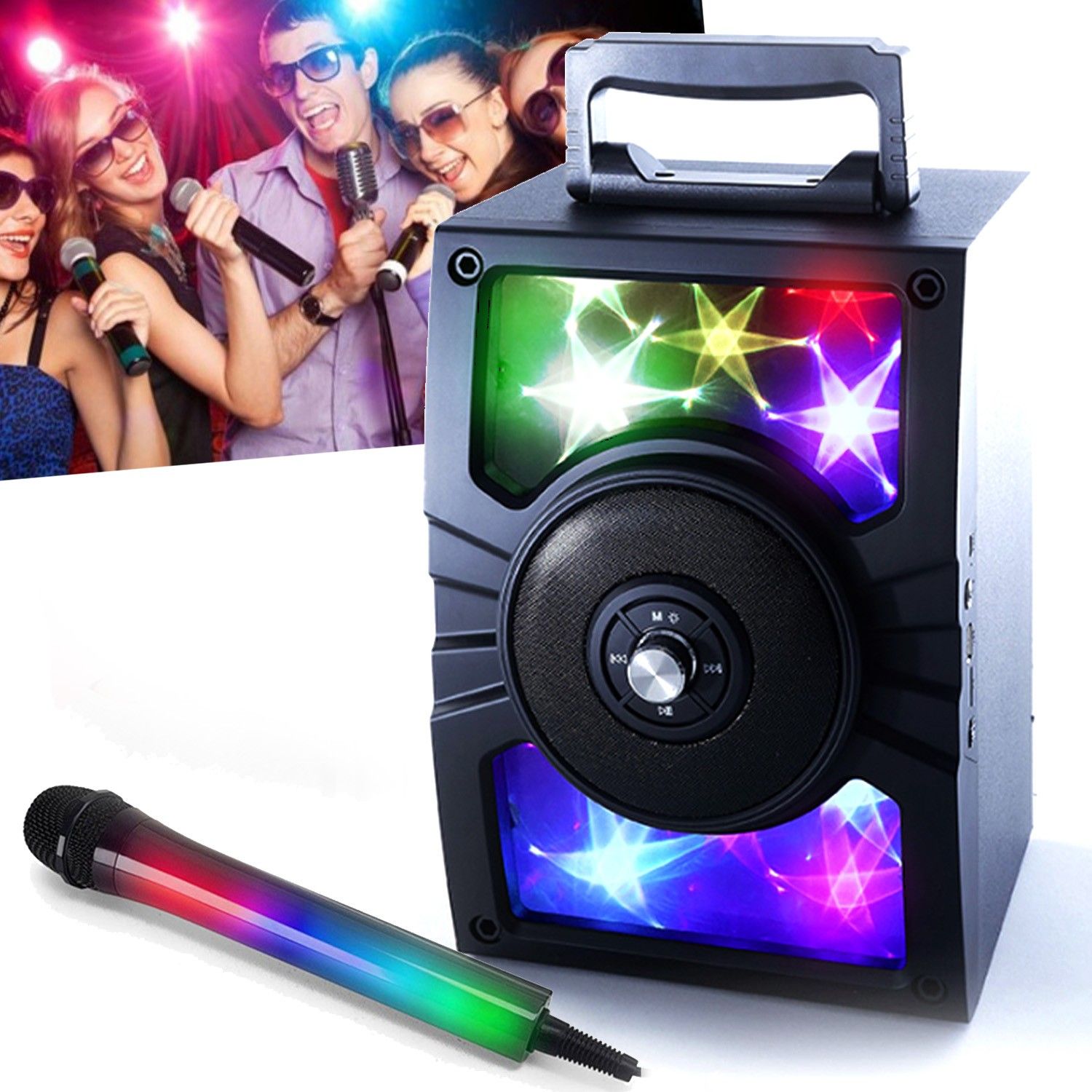 R-MUSIC – DUOLED – Enceinte RGB sans Fil avec 2 micros Karaoké – Ports AUX/Micro SD/USB, 11 Jeux de lumières, 2 micros Inclus, Support pour Smartphone, Déformation de Voix