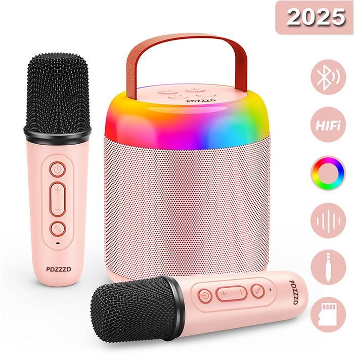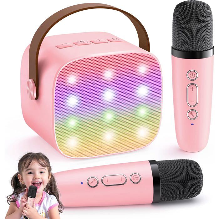 Micro Karaoké Enfant avec 2 Micros Sans Fil Karaoké Protable Bluetooth 5.3 LED Lumières Enceinte Karaoke (Rose)