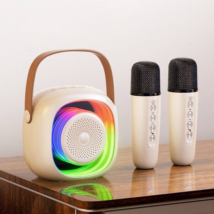 Enceinte Portable Bluetooth 5.3 Fonction karaoké basses percutantes LED colorées avec 2 Micro sans Fil pour Fête - Beige
