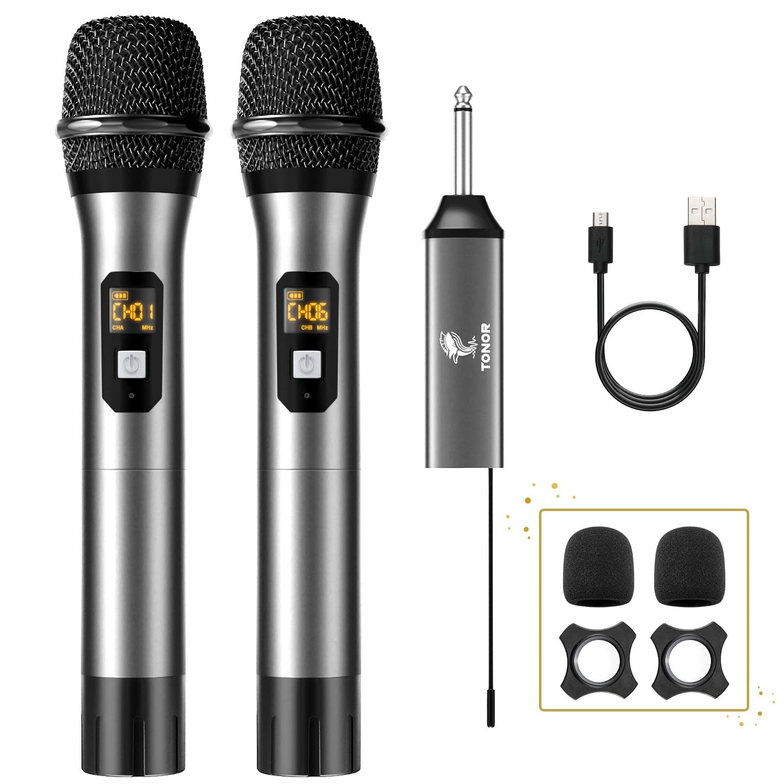 TONOR Micro sans Fil, Microphone sans Fil Rechargeable Professionnel, Micro Dynamique en Métal 2x100 UHF pour Karaoké/église/Chant/Mariage/DJ, Volume Réglable, 262ft Range, TW520