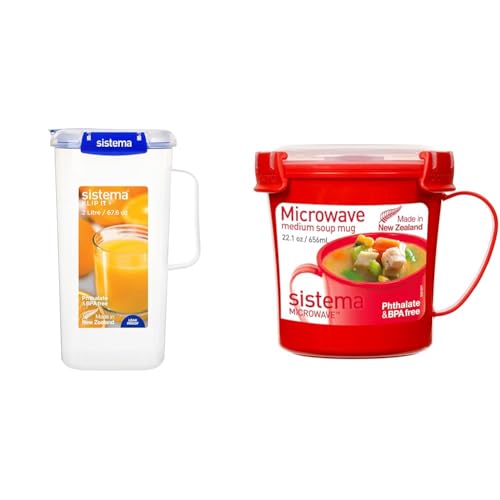 Sistema Pichet, Clair, 2 L & Microwave mug à soupe micro-ondable pour soupe, ragoût, nouilles et boissons chaudes, moyen modèle 656 ml, rouge/transparent