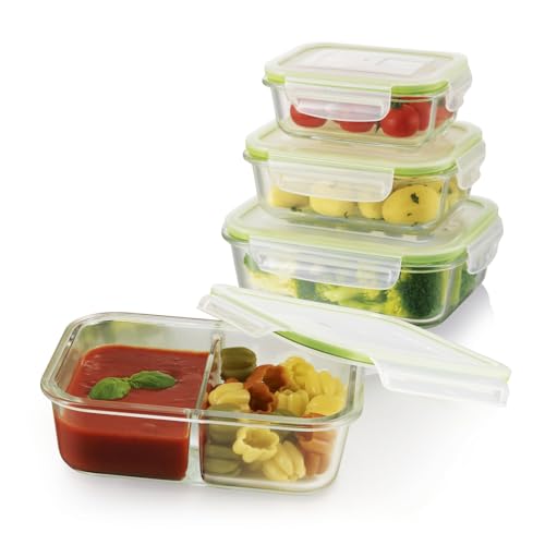 GOURMETmaxx Klick-It Glass Food Storage Containers, Set of 4, Dishwasher, Microwave and Freezer Safe, Lid with Silicone Sealing Ring and 4-Way Click Closure, Lime Green