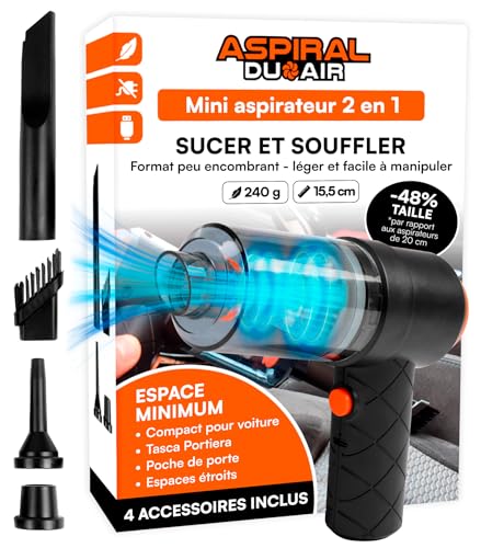 Eurocali Aspirateur Voiture à Main sans Fil Maison et Bureau - Aspiral DuoAir Mini Aspirateur Souffleur Portable 2en1 avec Chargement USB Rapide et 4 Accessoires Inclus - Dimensions 14x15,5x5,5cm
