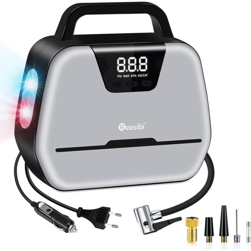 RHG Gonfleur Pneus Voiture 12V 150PSI AC DC Double Alimentation, Mini Compresseur à Air Numérique pour Vélo Moto Balle, avec Lampe LED, Jeu