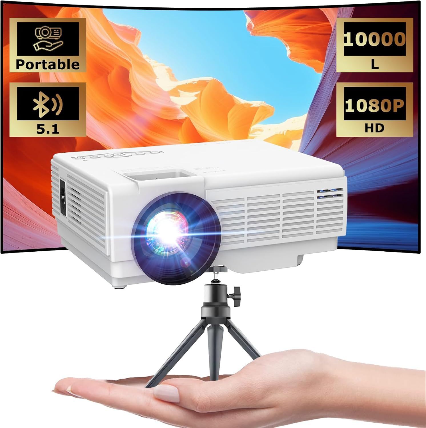 Mini Projecteur Avec Bluetooth Et Trépied,Videoprojecteur Portable 1080P Full Hd,10000L Mini Retroprojecteur Portatif Led Pour Home Cinéma,Compatible Avec Smartphone Hdmi Usb Tv Stick