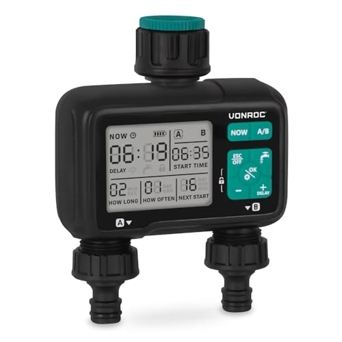 VONROC Minuteur d'eau - Ordinateur d'irrigation - Système d'arrosage Automatique - Intervalle et durée réglables : 1 Heure à 15 Jours/1 Seconde à 99 Min (2 Voies sans système d'irrigation)