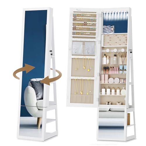 Hzuaneri Armoire à bijoux 16 LEDs, 160cm organisateur de bijoux sur pied avec base rotative à 360°, miroir verrouillable sur toute la longueur, Blanc et Beige JC16003BE