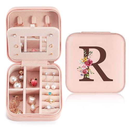 Sinekong Boîte à Bijoux avec Lettre Initiale R Petit Boite a Bijoux Femme avec Miroir Boite à Bijoux de Voyage Coffret à Bijoux en Cuir PU pour Femme et Fille Cadeau pour Mariage Anniversaire Noël