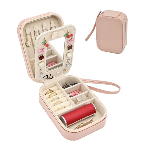 Kzouenzu Boite A Bijoux [Avec Miroir], Petite Boîte À Bijoux De Voyage, Organisateur De Boîte À Bijoux Portable Pour Colliers Boucles D'oreilles, Idée Cadeau Pour Femmes Et Filles [Rose]
