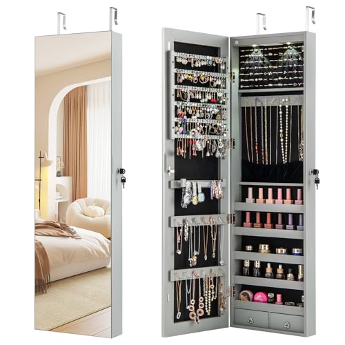 GOPLUS Armoire à Bijoux avec Miroir, Armoire a Bijoux Murale avec Éclairage LED, 2 Tiroirs, Fixer au Mur ou à Suspendre sur Porte, pour Ranger Boucles d'Oreilles et Colliers (Gris)