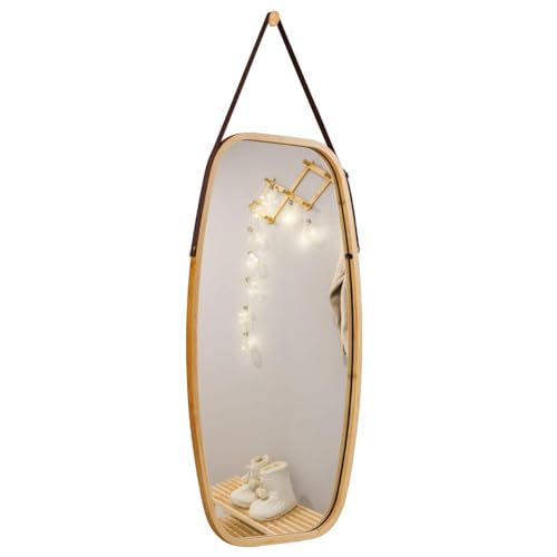 FANTASK Miroir Mural, Miroir de Salle de Bain Suspendu avec Bracelet en Cuir réglable et Cadre en Bambou, Miroir Bijoux avec Coins arrondis pour entrée, Salon et Chambre à Coucher