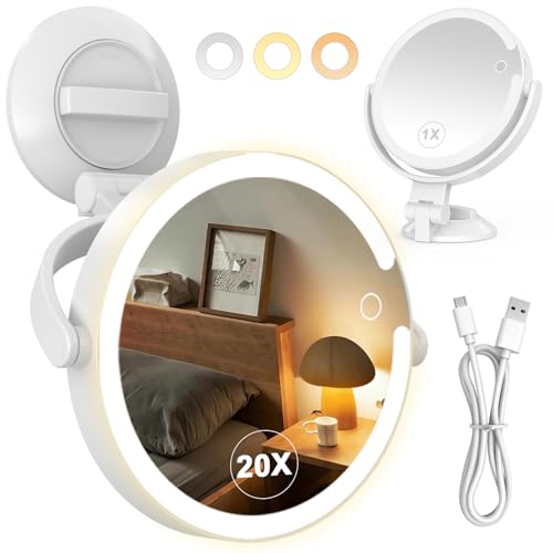 Auxmir Miroir Grossissant 20X Lumineux, Miroir Maquillage avec Ventouse sans Fil avec 3 Réglages D'éclairage LED, Rotation à 360° pour Salles de Bain et Voyage