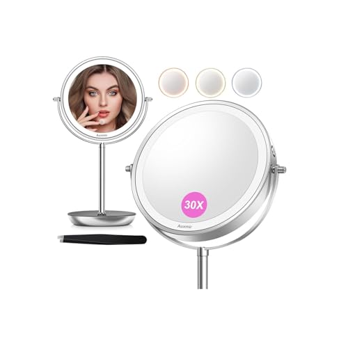 Auxmir 8 Pouces Miroir Grossissant Lumineux, 30X/1X Double Face, Miroir Grossissant sur Pied, Mirroir Maquillage Lumineux Rechargeable avec 3 Couleurs, Mirroir LED Rotation à 360° pour Chambre, Bureau