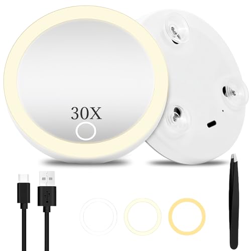 Miroir Grossissant Lumineux 30X, 15cm - 3 Modes de Couleur Dimming, Grand Miroir de Voyage Rechargeable avec 3 Ventouses et Support de Table 360°