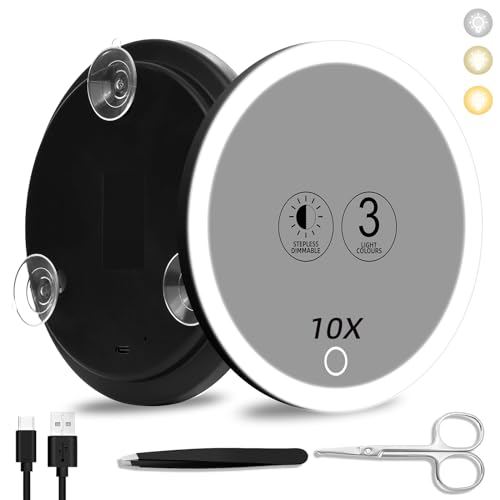 Superviseur Miroir Grossissant x10 Lumineux, 3 Couleurs d’Intensité Variable et 3 Ventouses, Miroir de Maquillage Portable avec Pince à Épiler et Ciseaux