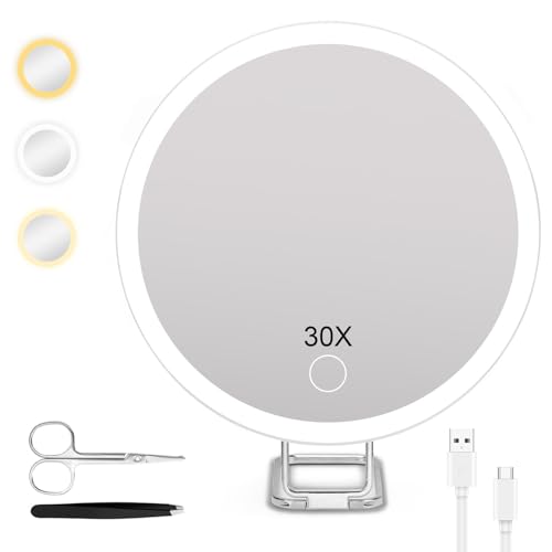 Miroir grossissant lumineux 30X/1X pour le maquillage, miroir grossissant double face 1X/30X avec 3 couleurs d'éclairage, miroir de bureau rechargeable avec grossissement 30X et rotation à 360°