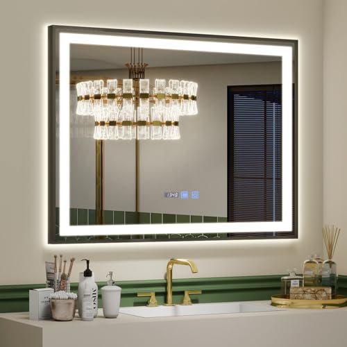 YU YUSING Miroir de Salle de Bain LED 80x60cm, Miroir Lumineux Cosmétique Mural avec 3 Couleurs de Lumière Réglables, Cadre Métallique, Affichage L'heure, Anti-buée, IP44 Étanchéité, Horizontal