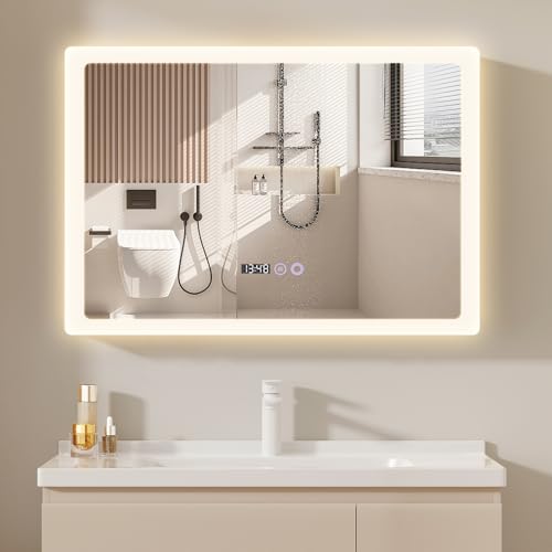 YU YUSING Miroir de Salle de Bain avec Éclairage 80x60cm, Miroir Lumineux LED Cosmétique Mural avec 3 Couleurs Dimmables de Lumière, Interrupteur Tactile, Anti-buée, Affichage L'heure, IP44 Étanchéité