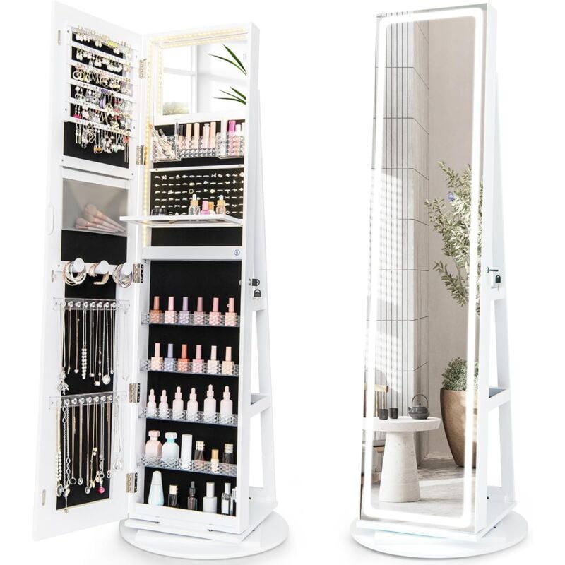 COSTWAY Armoire à Bijoux avec Miroir sur Pieds, Pivotant 360°, Grand Miroir Psyché Sans Cadre avec LED, Verrouillable, Placard Beauté, 3 Étagères,